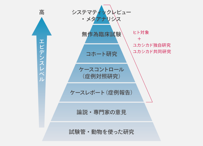 ユカシカドでは、報告されている知的生産物および/もしくは自社で行った研究結果(未報告のものを含む)といった、実験や調査などの研究結果によって裏付けされた科学的根拠(エビデンス)を重視し事業を行っています。知的生産物を用いて科学的な情報を活用する際には、情報のトレーサビリティが取れているもの(一次情報が取得可能)を活用するものとします。原則として、参照するのはヒトを対象とした研究とし、参照するのに適切かを十分に吟味するものとします。また、提供する情報では引用元を明らかにします。