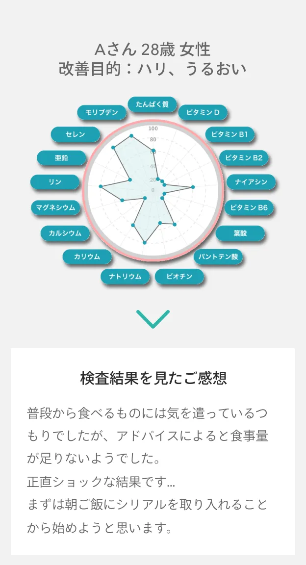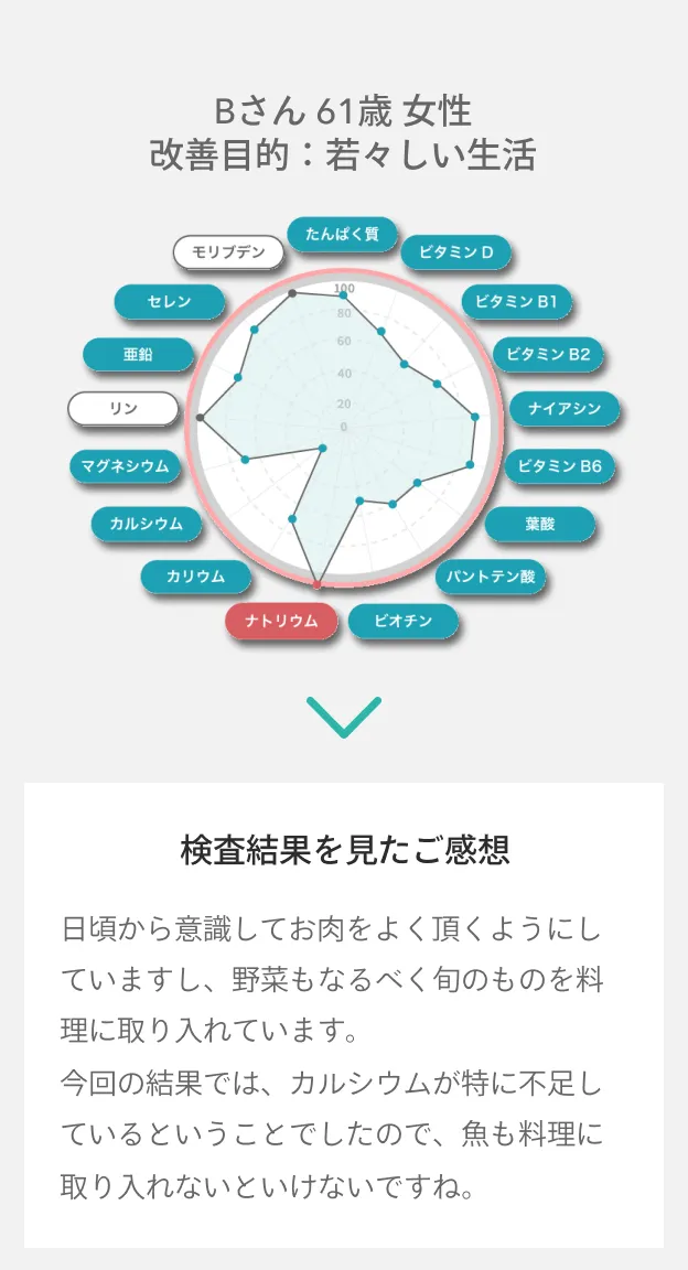 20代 女性お医者さんから塩分を控えるように言われていたが、本当に数値が高くてびっくり。しっかり減塩に取り組み、結果につながって嬉しい。