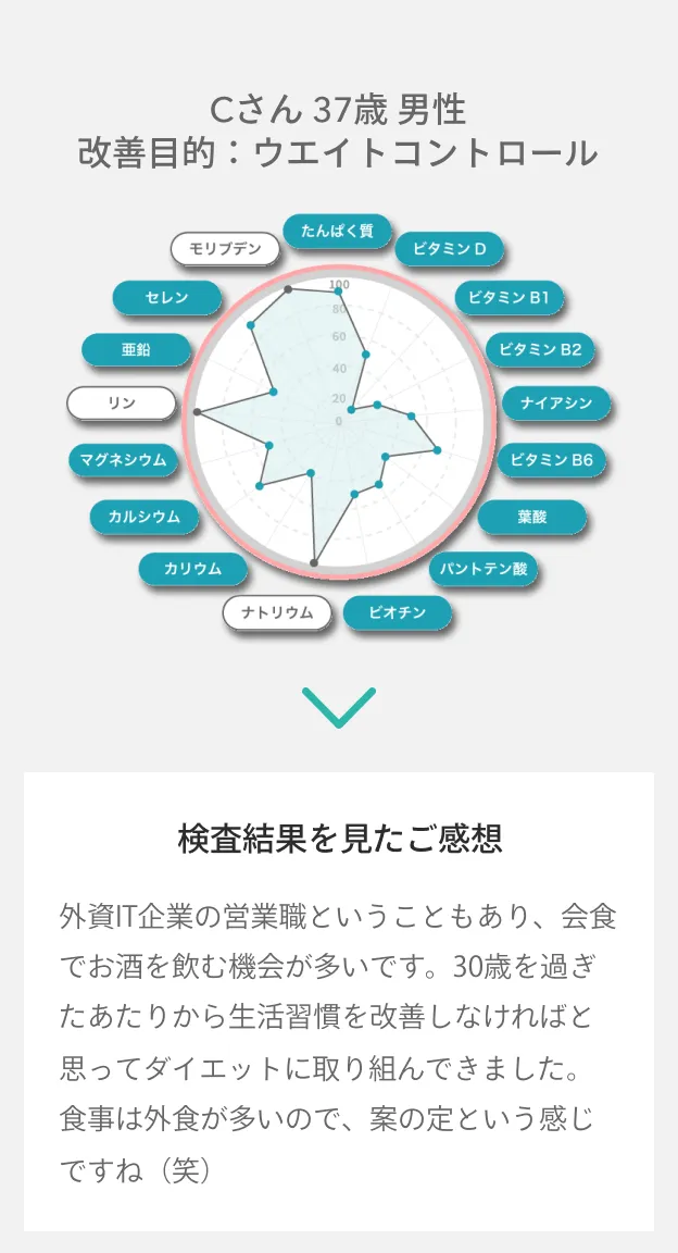 50代 男性結果を見て母親の意識が変わり、食生活を変えてくれるようになったのがなにより嬉しい。